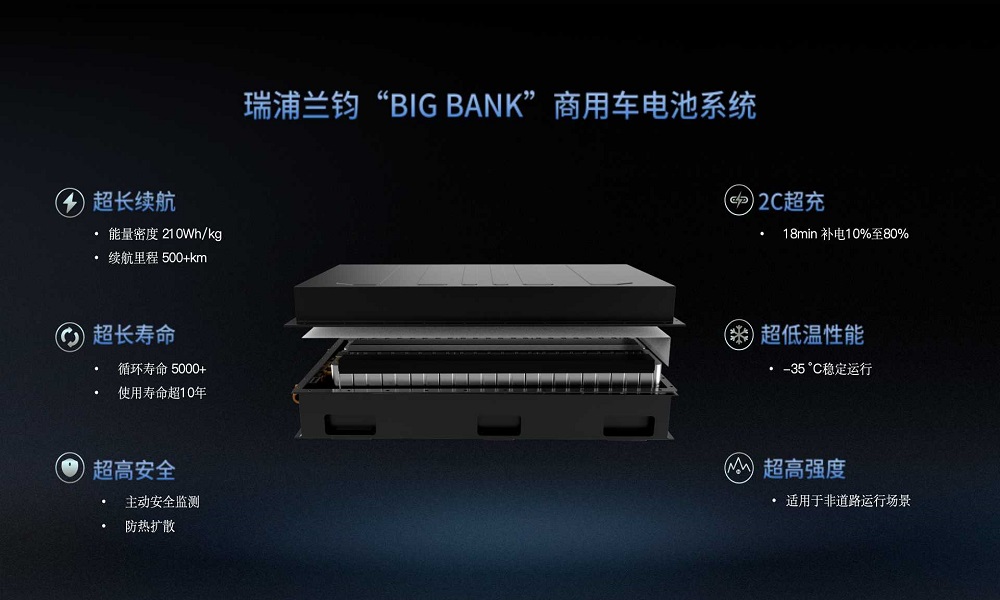 瑞浦兰钧“BIG BANK”商用车电池系统不仅是独立的产品,更是瑞浦兰钧为满足多场景需求而研发的系统性解决方案,通过电池系统的灵活组合,可应对货运及物流领域不同车型、不同运输距离的需求,最长续航里程可突破600km。