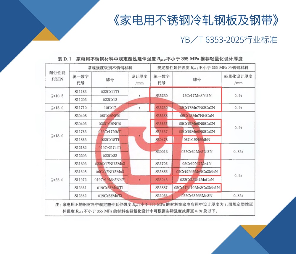 3月1日,青拓集团联手美的集团共同编制的《家电用不锈钢冷轧钢板及钢带》YB∕T 6353-2025行业标准正式实施,该标准规范了家电用不锈钢选材、表面质量和性能要求。更为重要的是,新标准明确了屈服强度Rp0.2在355MPa以上的高强度不锈钢,相比传统304不锈钢可实现减薄10%以上。