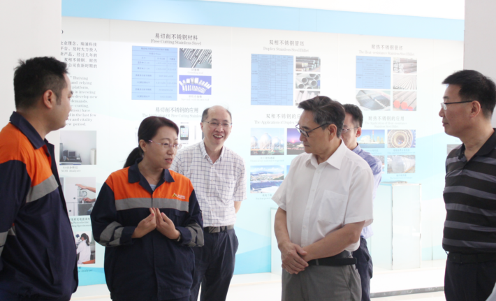 李云林一行先后参观了生产车间、展厅及特钢研究院,沈亮介绍了不锈钢生产工艺流程、产品类型及日常应用等情况。在特钢研究院,一行人员仔细询问了院士工作站的具体建设情况、研究院人员基本情况及公司近期新产品的研发情况。周一玲针对公司的产品结构组成以及近期研发概况进行了详细汇报,她表示:公司近期成功研发了多个高端400系列不锈钢产品,包括医疗器械用钢、建筑装饰行业螺栓不锈钢、不锈轴承用钢及未来用于各种海洋工程重要领域的双相螺纹钢等等,为今后公司进一步优化产品结构打下了良好基础。