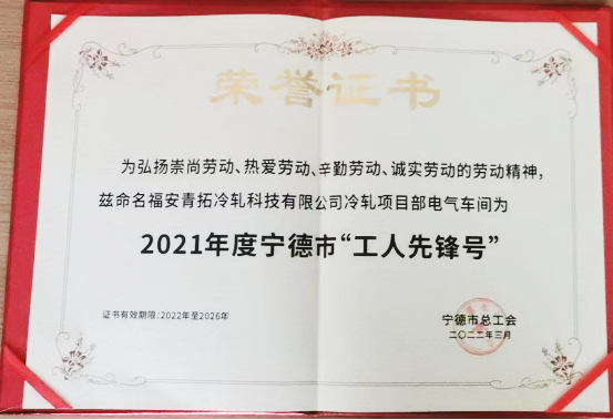 近日,宁德市总工会公布2021年宁德市“工人先锋号”名单,评选出一批在宁德打造“增长极”、建设“四个区”战略中做出突出贡献的50个先进集体。福安青拓冷轧科技有限公司冷轧项目部电气车间被授予宁德市“工人先锋号”称号。